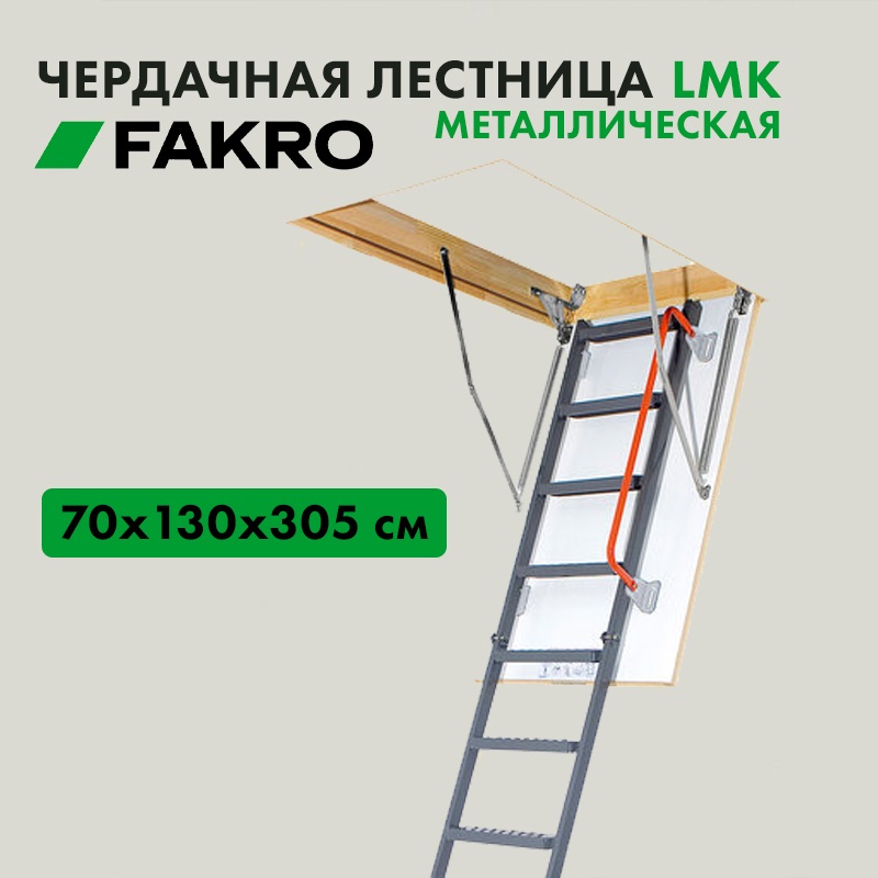Складная металлическая чердачная лестница LMK обеспечивает простой и безопасный подъем на чердак, а также позволяет сэкономить свободное пространство в доме, так как легко складывается и убирается в потолок.