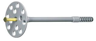 За счет широкой шляпки дюбель часто называют "парашют" или тарельчатый дюбель. Конструкция широкой шляпки дюбеля плотно прижимает теплоизоляцию, отверстия позволяют утопить дюбель в клее без потери эластичности шляпки, нейлон обеспечивает надежное сцепление с материалом основания. В комплекте с дюбелем поставляется металлический оцинкованный гвоздь.