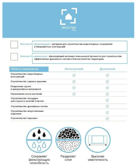 Экоспан Гео Фильтрующий представляет собой нетканое термоскрепленное полотно из бесконечных полипропиленовых волокон. Применяется для строительства водоотводных сооружений и ландшафтных конструкций. Экоспан Гео Фильтрующий не подвержен гниению и воздействию грибков и плесени, не теряет своих качеств под воздействием пресной и соленой воды. Экоспан…