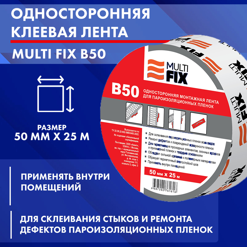 MULTI FIX B50 - Однослойная лента для монтажа пароизоляции (внутри помещений) Область применения: Применяется для склеивания стыков и ремонта дефектов пароизоляционных пленок всех видов. Используется для герметизации проходных элементов, оконных проемов и примыканий пленок к твердым основаниям. Применять внутри помещений. Преимущества: - Сильная адгезия к…