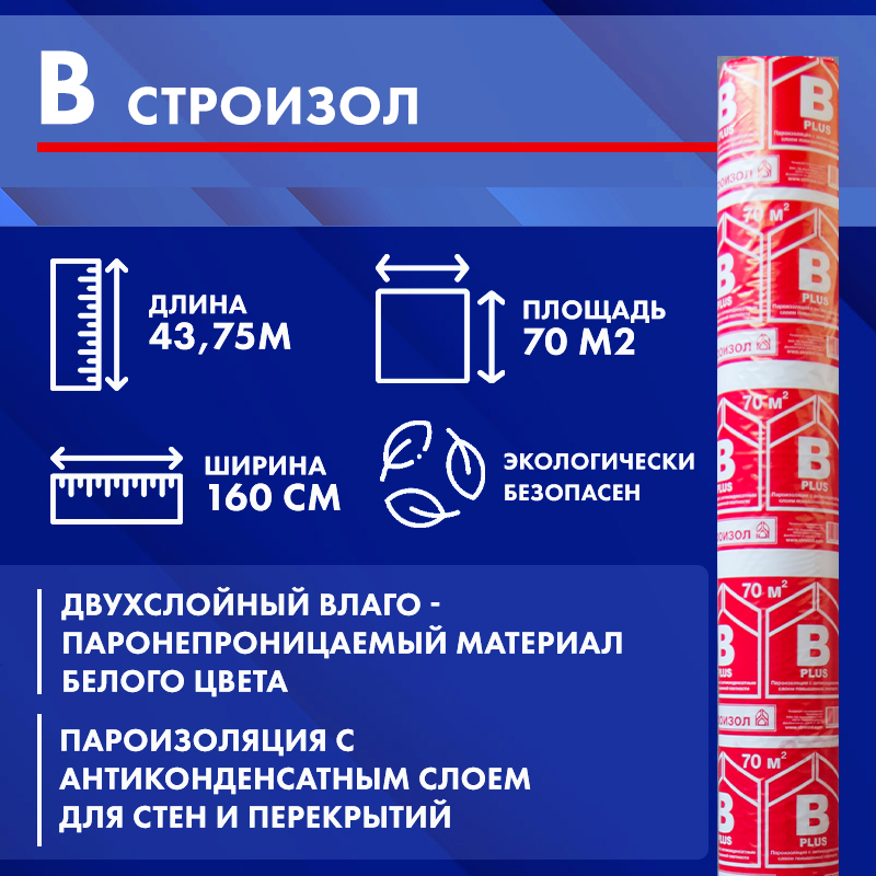 СТРОИЗОЛ B PLUS - Пароизоляция с антиконденсатным слоем для стен и перекрытий (повышенной плотности) Строизол В - двухслойный влаго-паронепроницаемый материал белого цвета. Представляет собой пленку из полипропилена, нанесенную на основу из нетканого полотна методом плоскощелевой экструзии. Одна сторона материала гладкая, другая имеет волокнистую поверхность,…