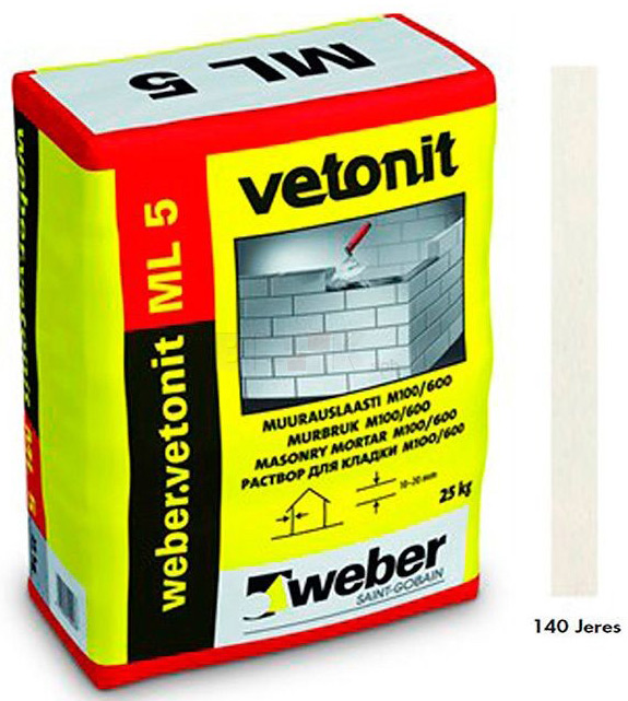 Weber.vetonit ML5 – цветная сухая смесь для кладки керамического и силикатного кирпича в малоэтажном строительстве. По специальному заказу выпускаются: weber.vetonit ML5 Т – плотный раствор со сниженным до 30% водопоглощающими свойствами шва. Применяется в условиях повышенной водной нагрузки, например в условиях частых интенсивных дождей на берегах моря, озер. …