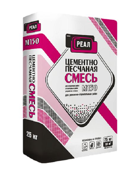 Сухая строительная цементно-песчаная смесь М150 РЕАЛ для внутренних и наружных работ. Предназначена для ремонтно-строительных работ: заделки выбоин, кирпичной кладки, выравнивания поверхностей из кирпича. При отрицательных температурах возможно применение с противоморозной добавкой РЕАЛ. Технические характеристики: Максимальная фракция заполнителя 5…