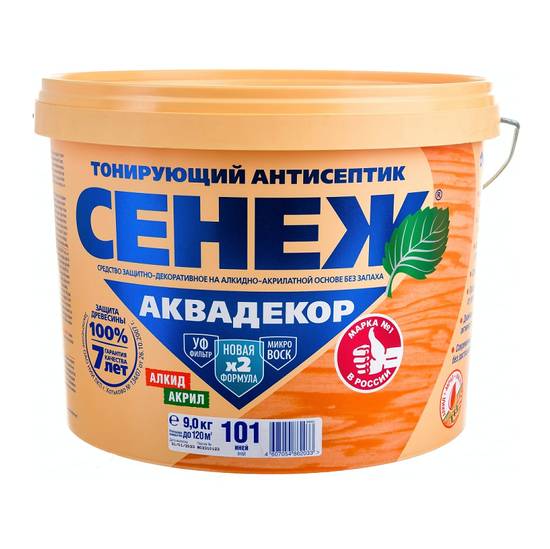 Антисептик СЕНЕЖ АКВАДЕКОР предназначен для долговременной защиты древесины от атмосферных осадков, плесневых, деревоокрашивающих и дереворазрушающих грибов, водорослей и насекомых-древоточцев, а также декоративной отделки под ценные породы.