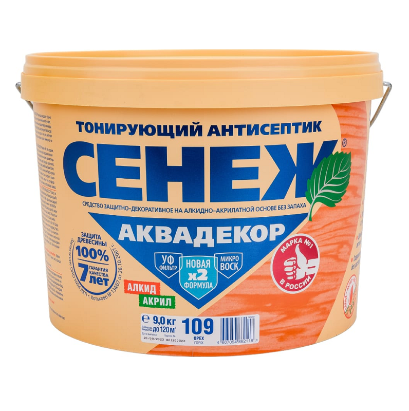 Антисептик СЕНЕЖ АКВАДЕКОР предназначен для долговременной защиты древесины от атмосферных осадков, плесневых, деревоокрашивающих и дереворазрушающих грибов, водорослей и насекомых-древоточцев, а также декоративной отделки под ценные породы.