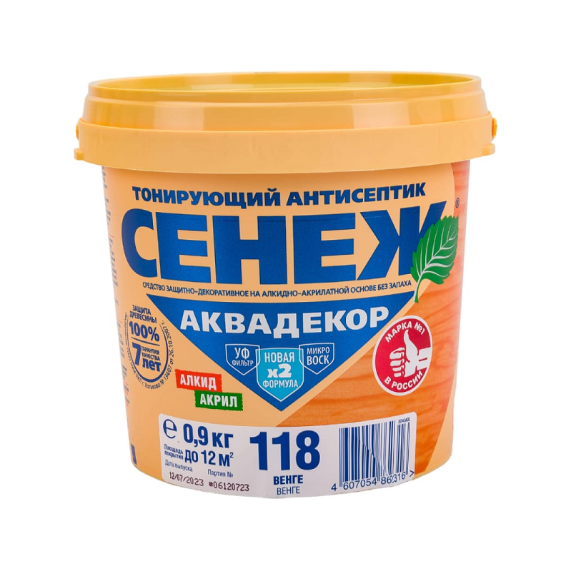 Антисептик СЕНЕЖ АКВАДЕКОР предназначен для долговременной защиты древесины от атмосферных осадков, плесневых, деревоокрашивающих и дереворазрушающих грибов, водорослей и насекомых-древоточцев, а также декоративной отделки под ценные породы.
