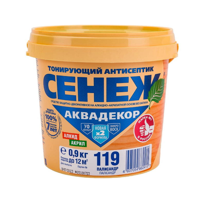 Антисептик СЕНЕЖ АКВАДЕКОР предназначен для долговременной защиты древесины от атмосферных осадков, плесневых, деревоокрашивающих и дереворазрушающих грибов, водорослей и насекомых-древоточцев, а также декоративной отделки под ценные породы.