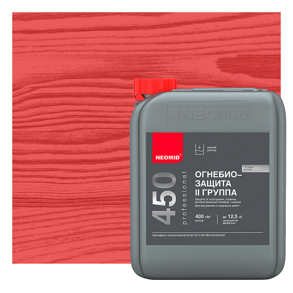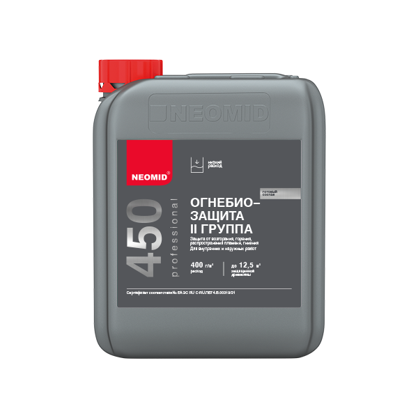 NEOMID 450 - высокоэффективный состав для огнезащиты и антисептирования древесины. Переводит древесину в трудновоспламеняемый и трудногорючий материал, обеспечивая II (вторую) группу огнезащитной эффективности согласно НПБ 251-98. Применяется для наружных и внутренних работ.