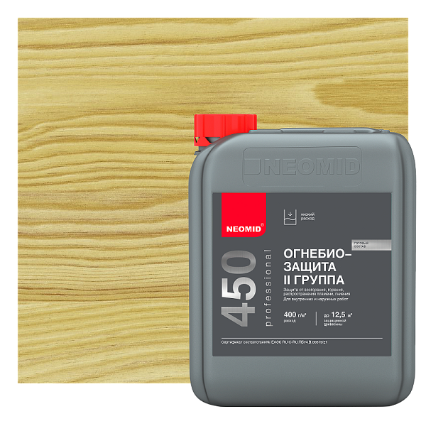 NEOMID 450 - высокоэффективный состав для огнезащиты и антисептирования древесины. Переводит древесину в трудновоспламеняемый и трудногорючий материал, обеспечивая II (вторую) группу огнезащитной эффективности согласно НПБ 251-98. Применяется для наружных и внутренних работ.