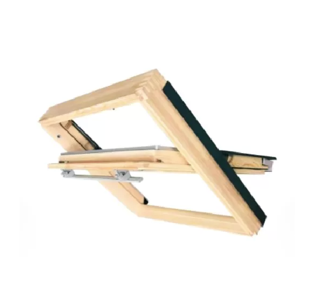 Среднеповоротное окно из высоко- качественной древесины без смоляных карманов и сучков. Центральные осевые шарниры придают конструкции необходимую прочность и жесткость в условиях ветровых и снеговых нагрузок. Внешний алюминиевый изоляционный оклад обеспечивает герметичность соединения оконного блока с кровельным покрытием.