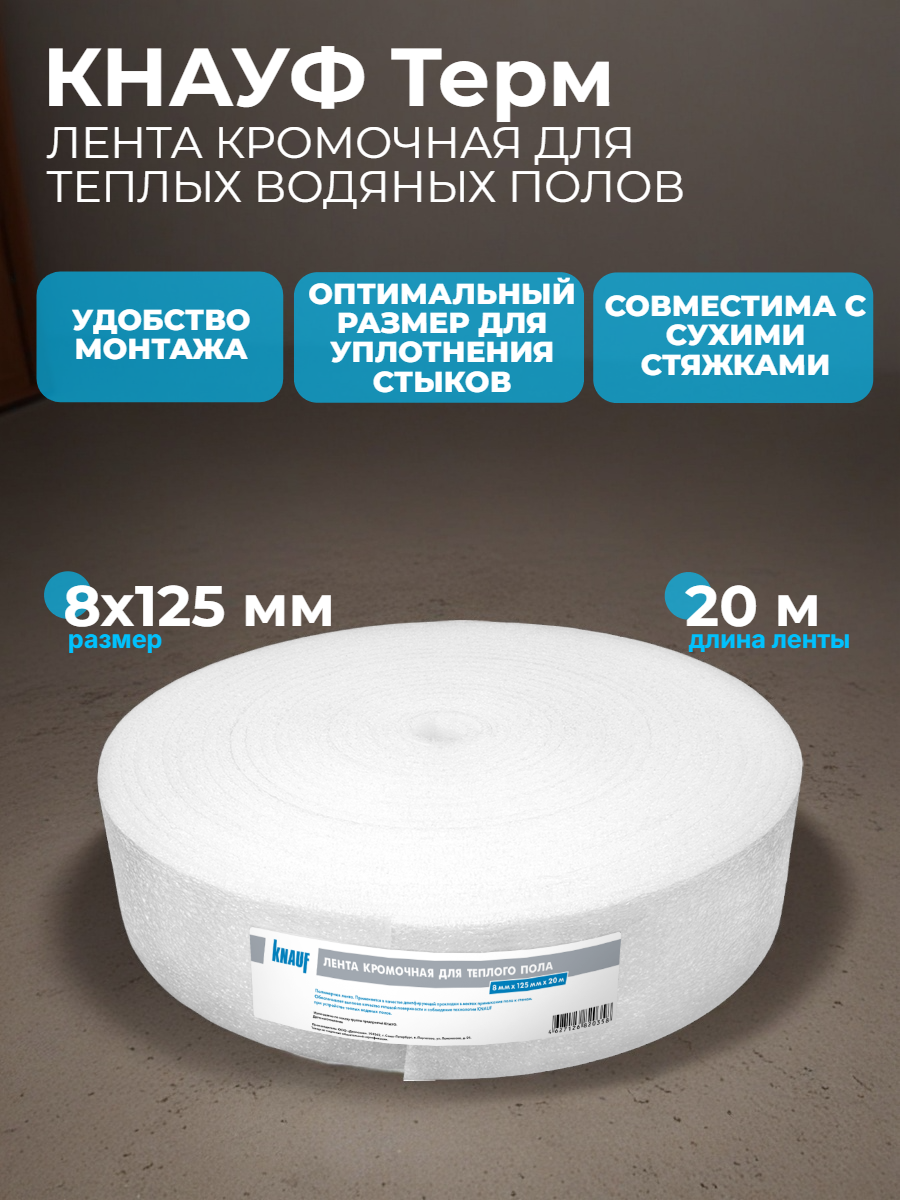 Лента кромочная КНАУФ ТЕРМ для теплого пола - это полимерная демпфирующая прокладка из вспененного полиэтилена, предназначенная для использования в системах сухих сборных стяжек и тёплых водяных полов по «сухой» технологии. Она применяется в местах примыкания пола к стенам, обеспечивая качественное финишное покрытие и соблюдение технологии…