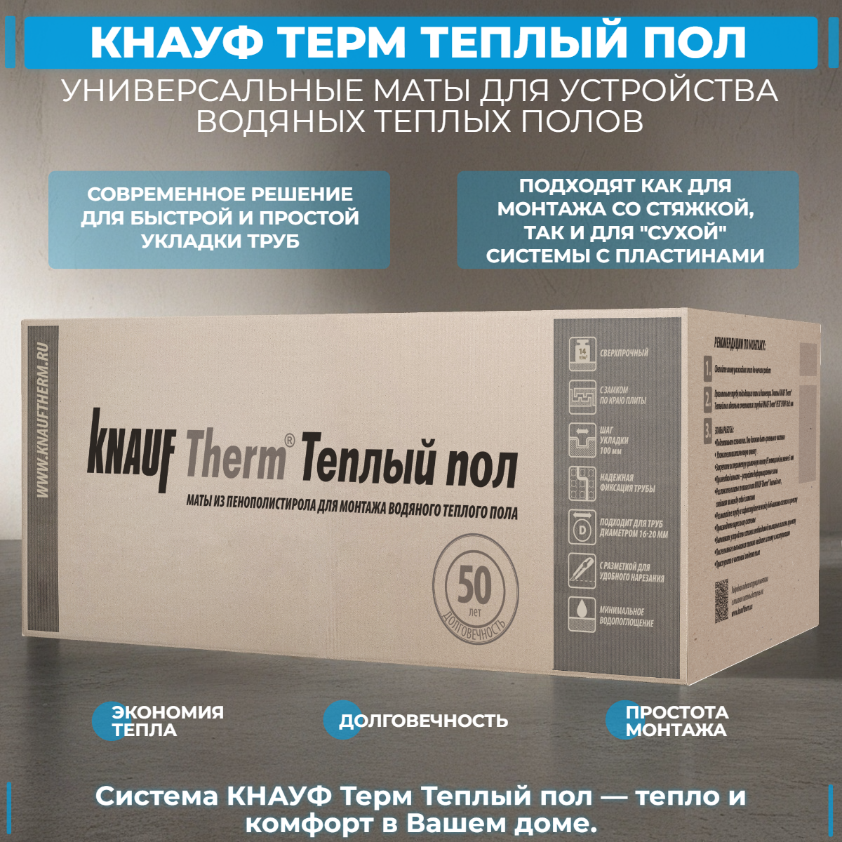 Теплоизоляционные формованные маты из пенополистирола для применения в системах теплых полов водяного типа. «Бобышки» помогают быстро и эффективно проложить, и зафиксировать отопительные трубы. Применение матов позволяет ускорить процесс монтажа и значительно повысить долговечность и износостойкость системы за счет отказа от металлической сетки и скоб. В…