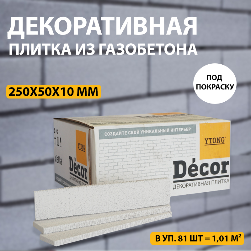 YTONG Decor – легкая декоративная плитка из газобетона под покраску. Оригинальное решение подходит для декорирования интерьеров и отделки кладки под любой дизайн. Она поможет реализовать дизайн интерьера в стилях лофт, индастриал, авангард, пэчворк, прованс. Представлена в размере: 250х50х10мм. Плитку легко обрезать под нужные размеры ножовкой c мелким…
