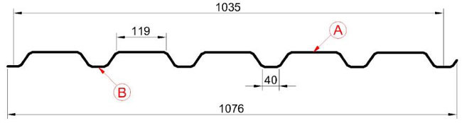 Профнастил МП-35х1035-A,B имеет трапецевидную форму с широкими ребрами жесткости (119 мм) и небольшим расстоянием между ними (40 мм), высота составляет 35 мм. Данная геометрия профиля обеспечивает повышенную устойчивость профиля к изгибу, конкретные характеристики указаны в технической документации материала.