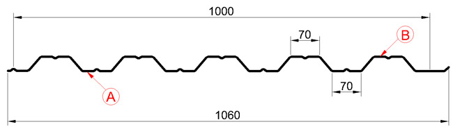 Профнастил НС-35x1000-A,В имеет трапецевидную форму с широко расположенными ребрами жесткости, высотой 35 мм и шириной 70 мм. Дополнительное усиление, устойчивость к изгибу и надежность придают профилю канавки. Данная геометрия позволяет использовать профнастил НС-35x1000-A,B не только для организации кровли и ограждений, но в качестве несущих конструкций со значительной нагрузкой.