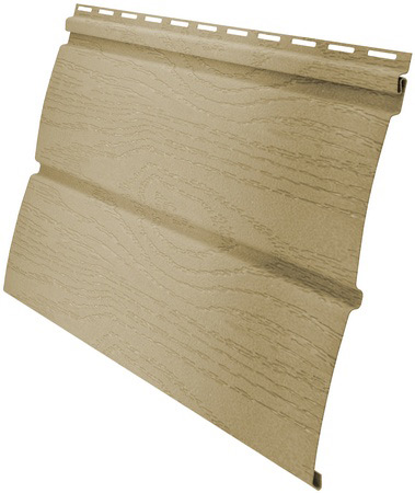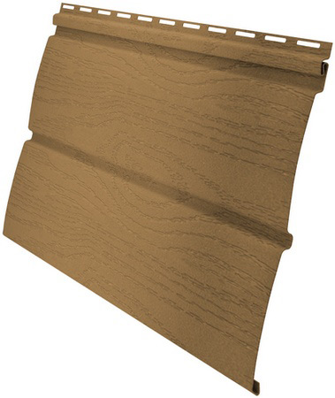 Геометрия панели (радиус ламели) сайдинга «Блок-хаус» D4,8 повторяет форму натурального бруса из ценной породы дерева — карельской сосны возрастом не менее 100 лет. Текстура поверхности со специальными «сучками» достоверно имитирует деревянный фасад.