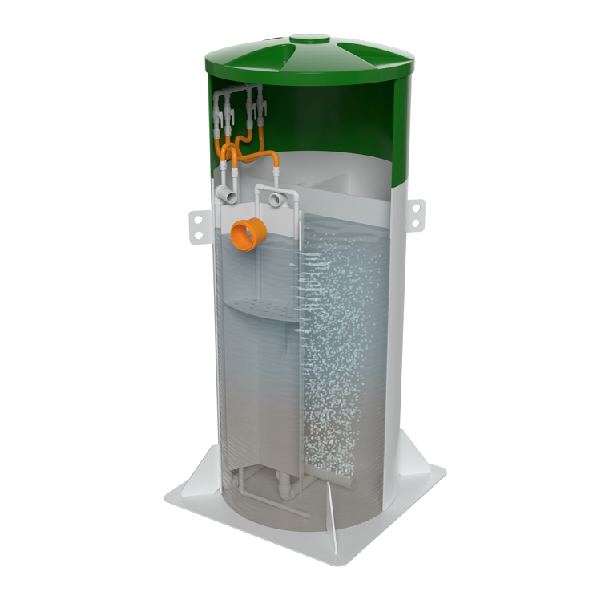 При работе станции не возникает неприятного запаха. Практически бесшумная работа позволяет устанавливать очистные сооружения в непосредственной близости от здания или дома. В очистных сооружениях используется наиболее эффективная технология очистки сточных вод – с использованием активного ила. Загрязняющие вещества, находящиеся в сточных водах, подвергаются естественным биологическим процессам и разлагаются в виде простых минеральных соединений, безвредных для окружающей среды. Эта технология также используется в крупных коммунальных очистных сооружениях. Благодаря наличию анаэробной и аэробной обработки стока и рециркуляции активного ила -очистка стока достигает очень высокого показателя в 98%. Компрессор для подачи воздуха в зону аэрации вынесен за пределы станции и находится в блок-модуле. Благодаря такому техническому решению компрессор не подвержен затоплению, как в большинстве других станций. Именно поэтому станция биологической очистки Колос отличается своей надежностью, эффективностью и длительным сроком службы.