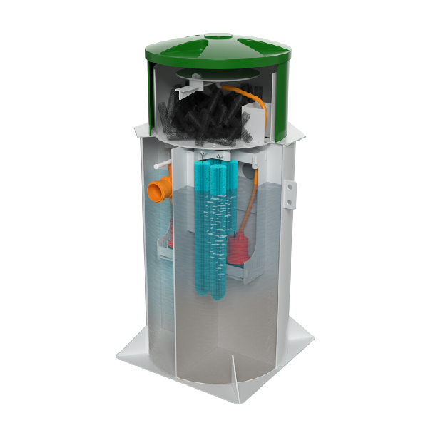Для удобства монтажа и обслуживания, станция укомплектована быстро съемными коннекторами для подключения насосов к элементам станции (система орошения биологической загрузки,принудительный сброс) полками для установки насосов, крепления для ершовой загрузки.  Цилиндрическая форма станции равномерно распределяет давления грунта, что препятствует сдавливанию станции, дно станции оснащено грунтозацепами, что предотвращает выдавливание станции из грунта.