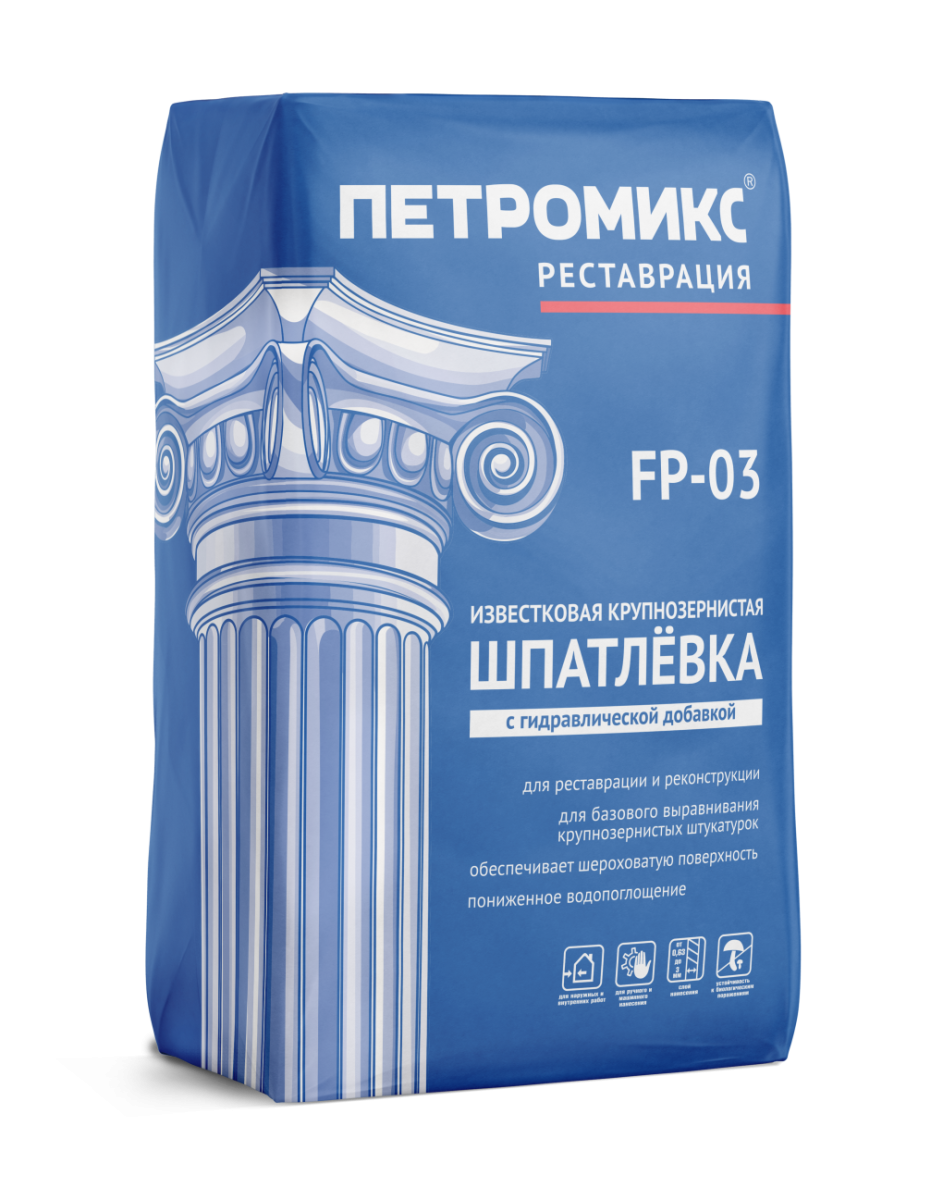 Данная шпатлевка предназначена для базового и финишного выравнивания крупнозернистых известковых и известково-цементных штукатурок при выполнении работ по реставрации и реконструкции. Для ручного нанесения. Технические характеристики. Максимальная фракция заполнителя: 0,63 мм Температура применения: от +5°С до +25°С Расход материала при слое: 1 мм 1–1,2…