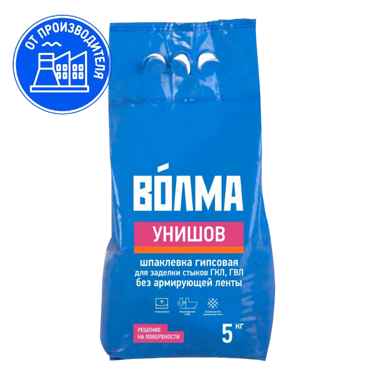 Шпатлевка Волма-Унишов - сухая шпатлевочная смесь на основе натурального гипсового вяжущего, модицифированная минеральными и химическими добавками, обеспе-чивающими высокую адгезию, водоудерживающую способность и оптимальное время работы. Основание: ГКЛ, ГВЛ, ГКЛО с утоненной, скошенной или полукруглой кромками Характеристики: Толщина нанесения минимальная - 1,0…