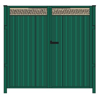 2 створки ворот, 2 опорных столба, регулируемые петли, угол открывания 180°, притворная планка, замок Locinox, 2 ригеля Locinox для фиксации створок в землю.